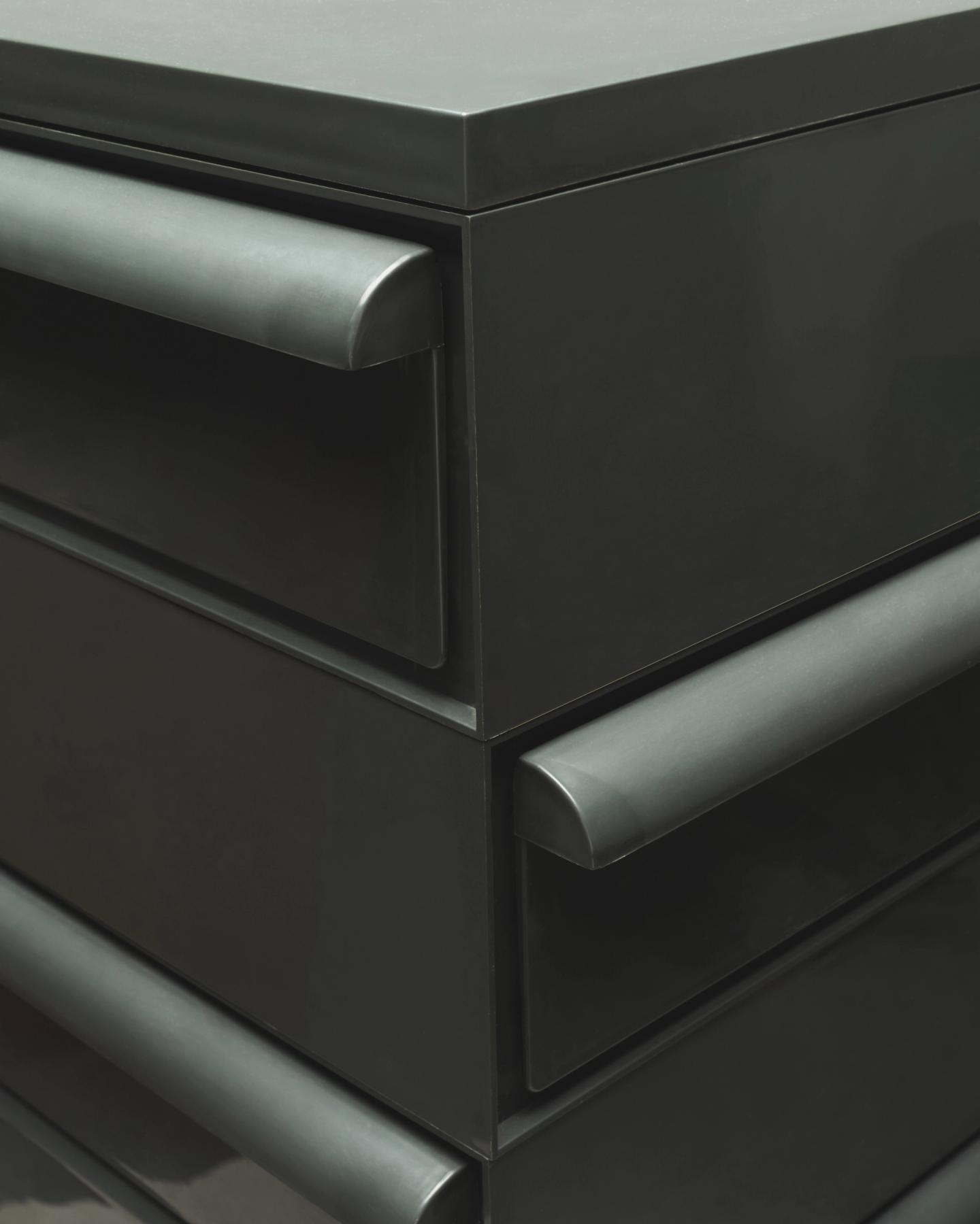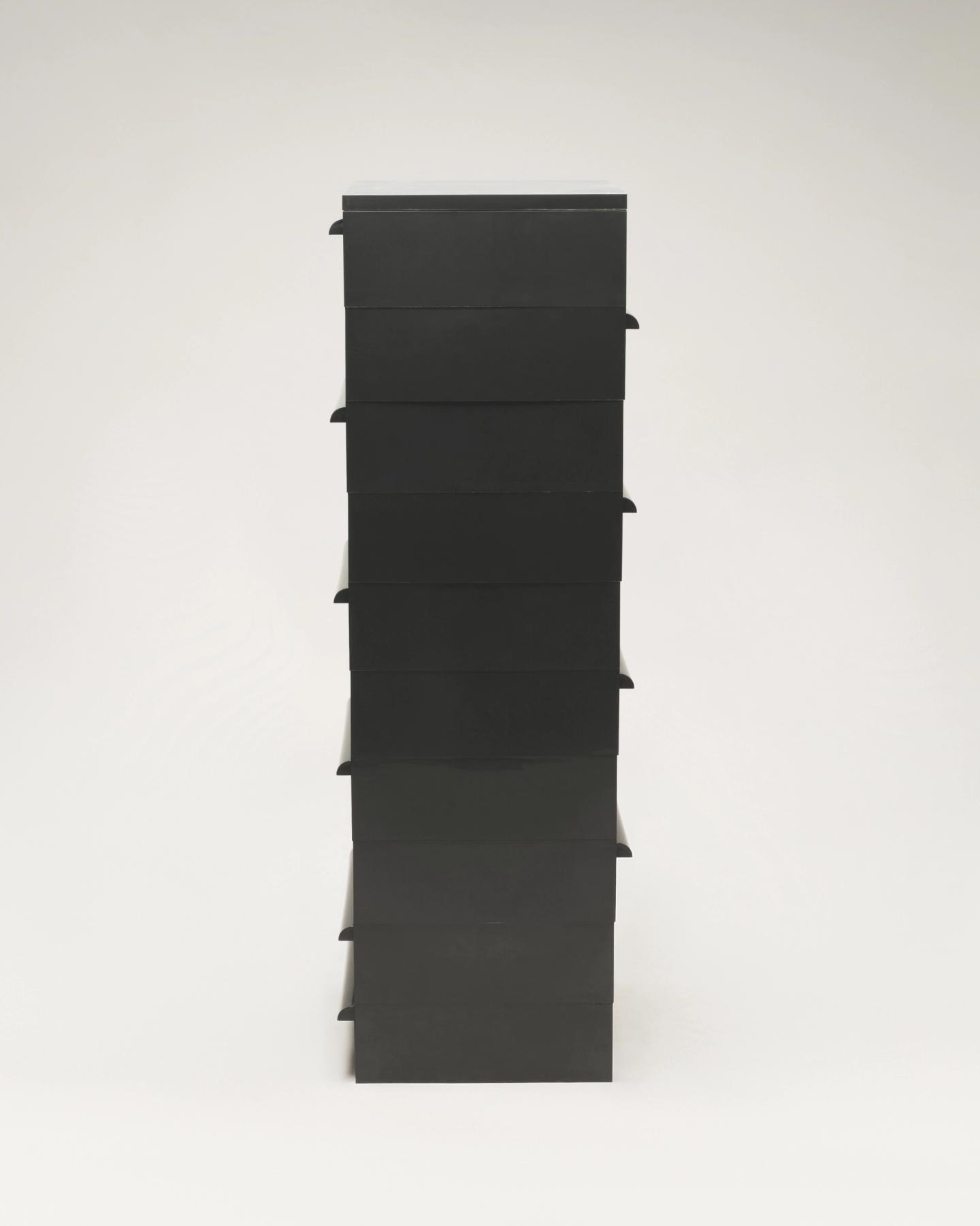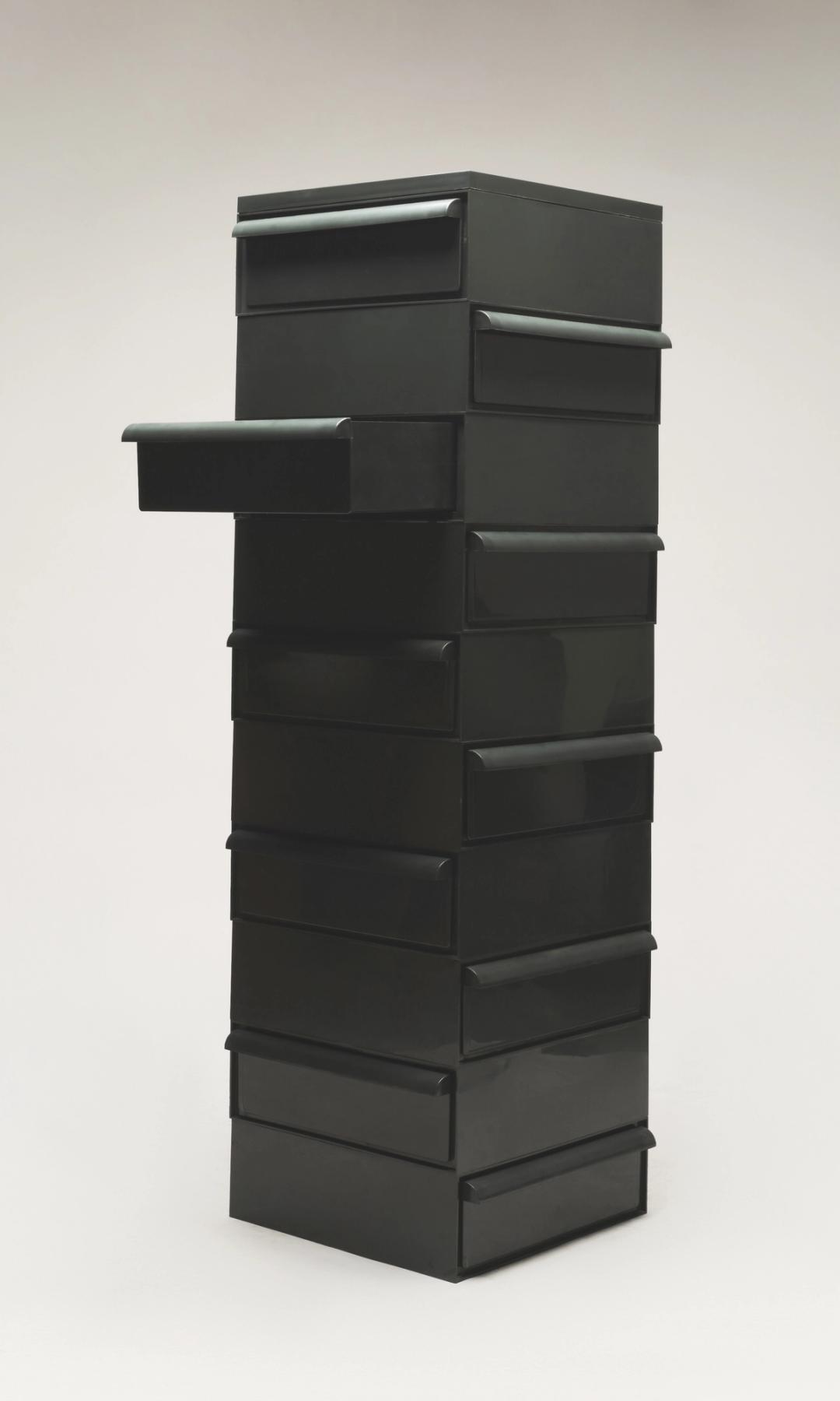 The "4601" stacking drawer was designed by Simon Fussel for Kartell in the 1970s. The drawers can be stacked in any direction allowing for endless configurations. This configuration includes 10 drawers in black ABS plastic.