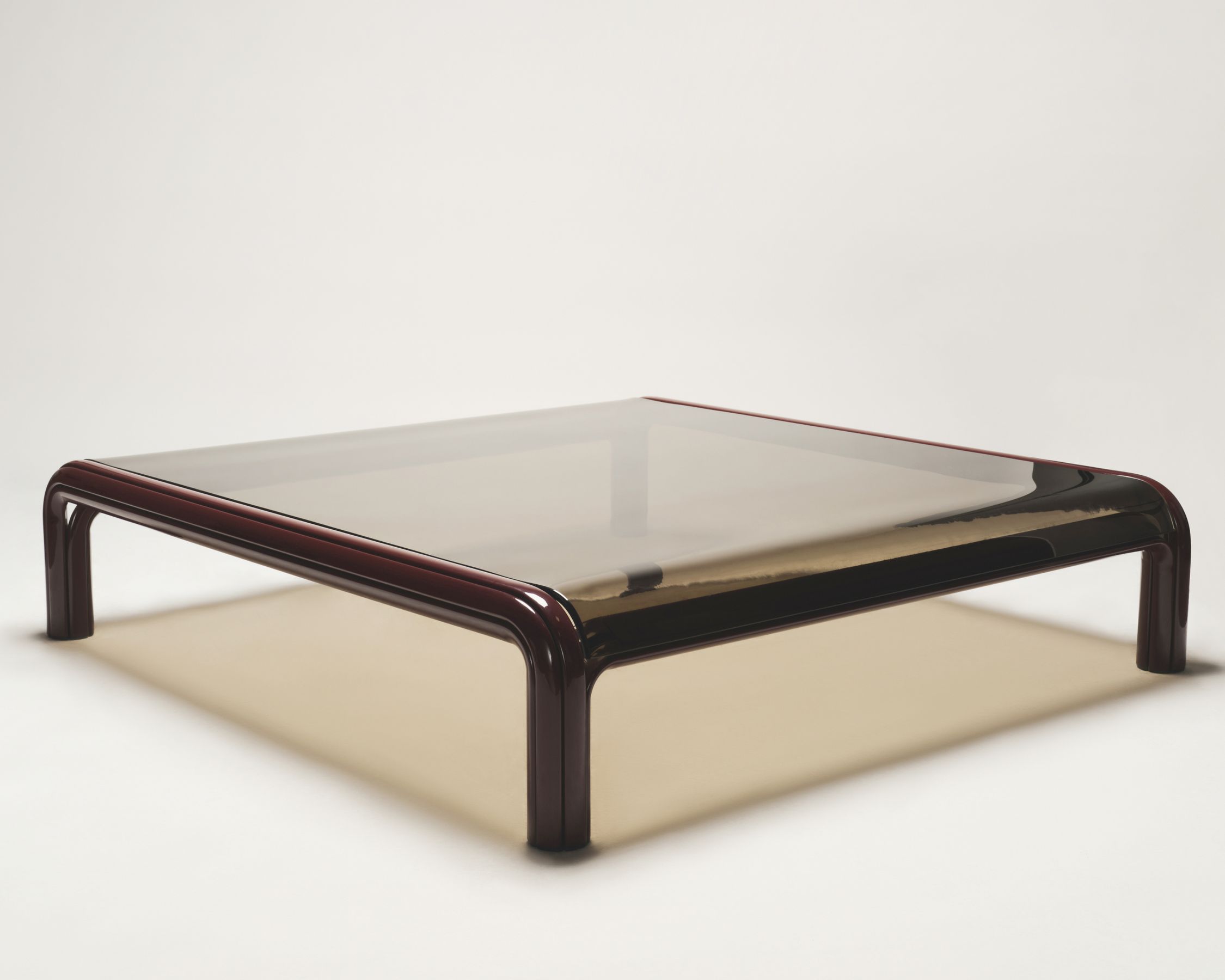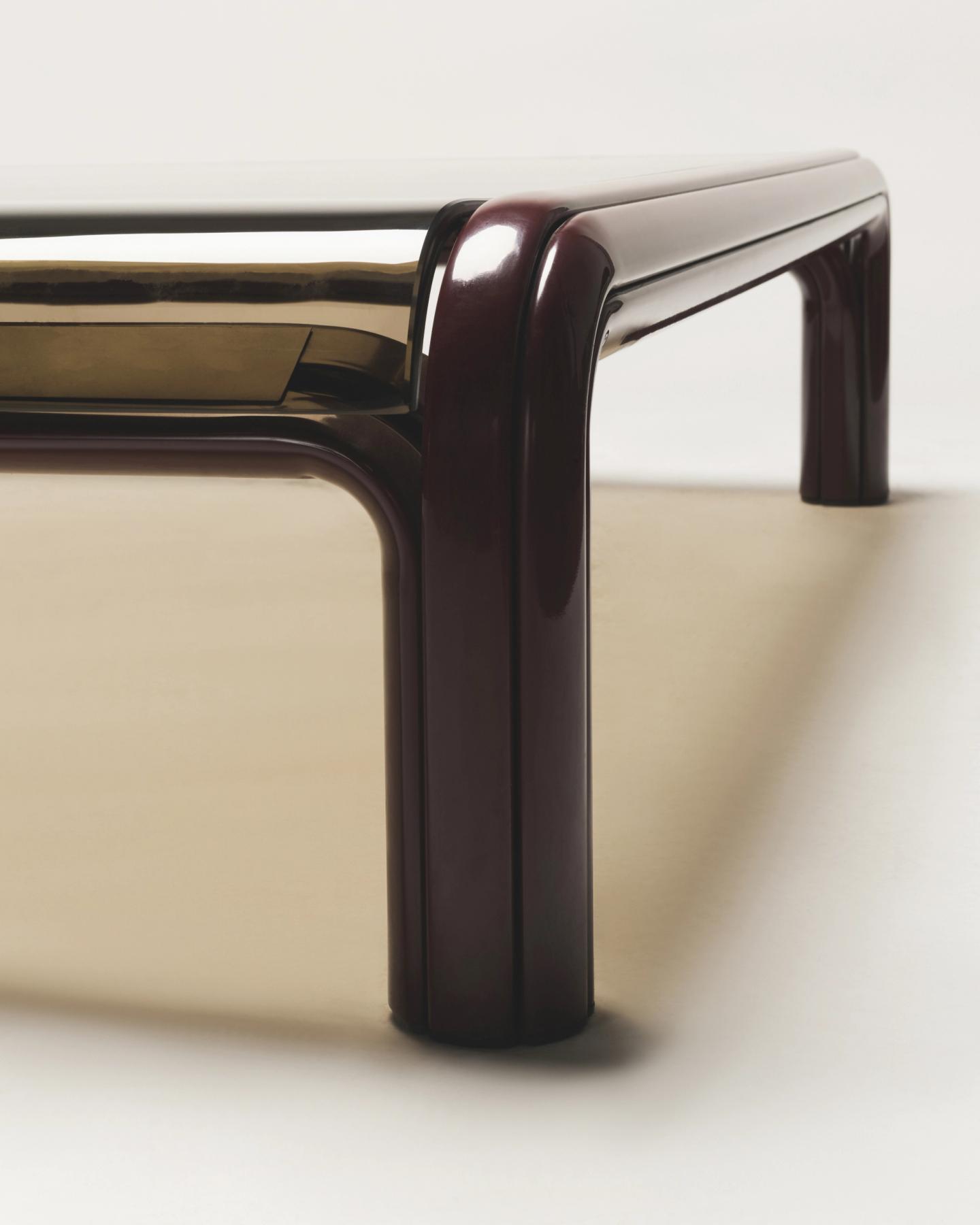 This coffee table was designed by Gae Aulenti for Knoll International in 1976 as part of the Lounge Collection with matching chairs and sofas. This model is composed of a maroon enameled channel metal body and a smoked glass top.