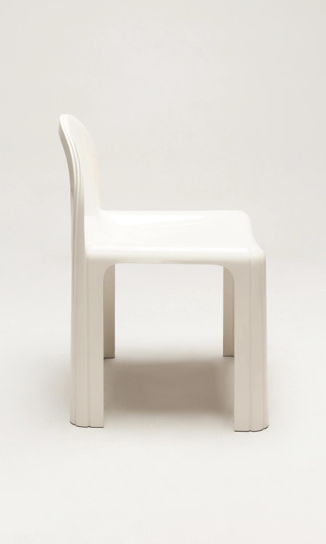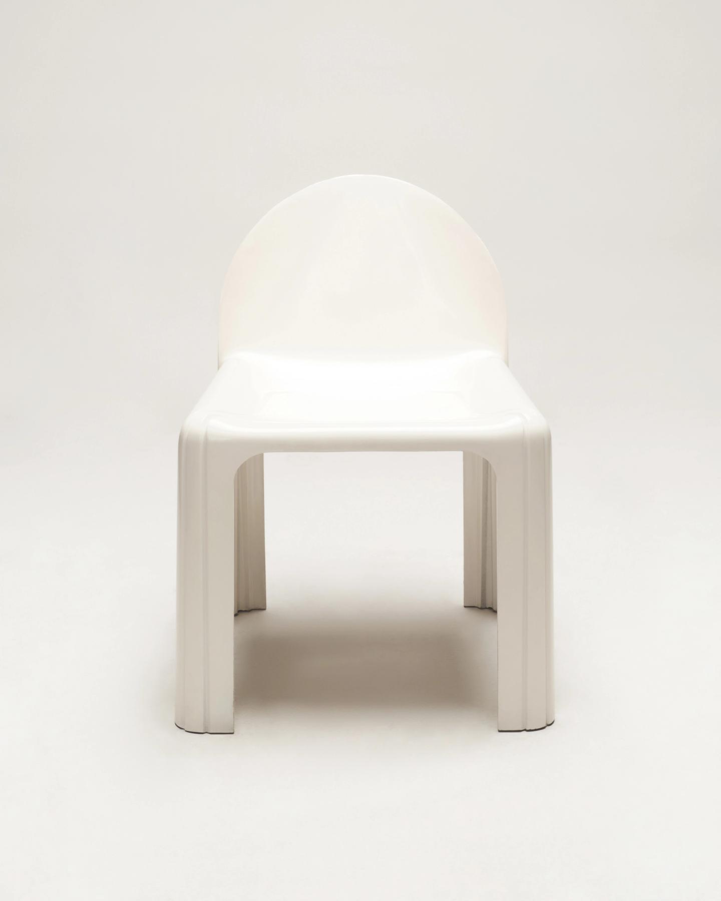 The "4854" chair was designed by Gae Aulenti for Kartell in the 1968 and is made of ABS plastic and coated in lacquer. It features Aulenti's characteristic curved lines and edges.