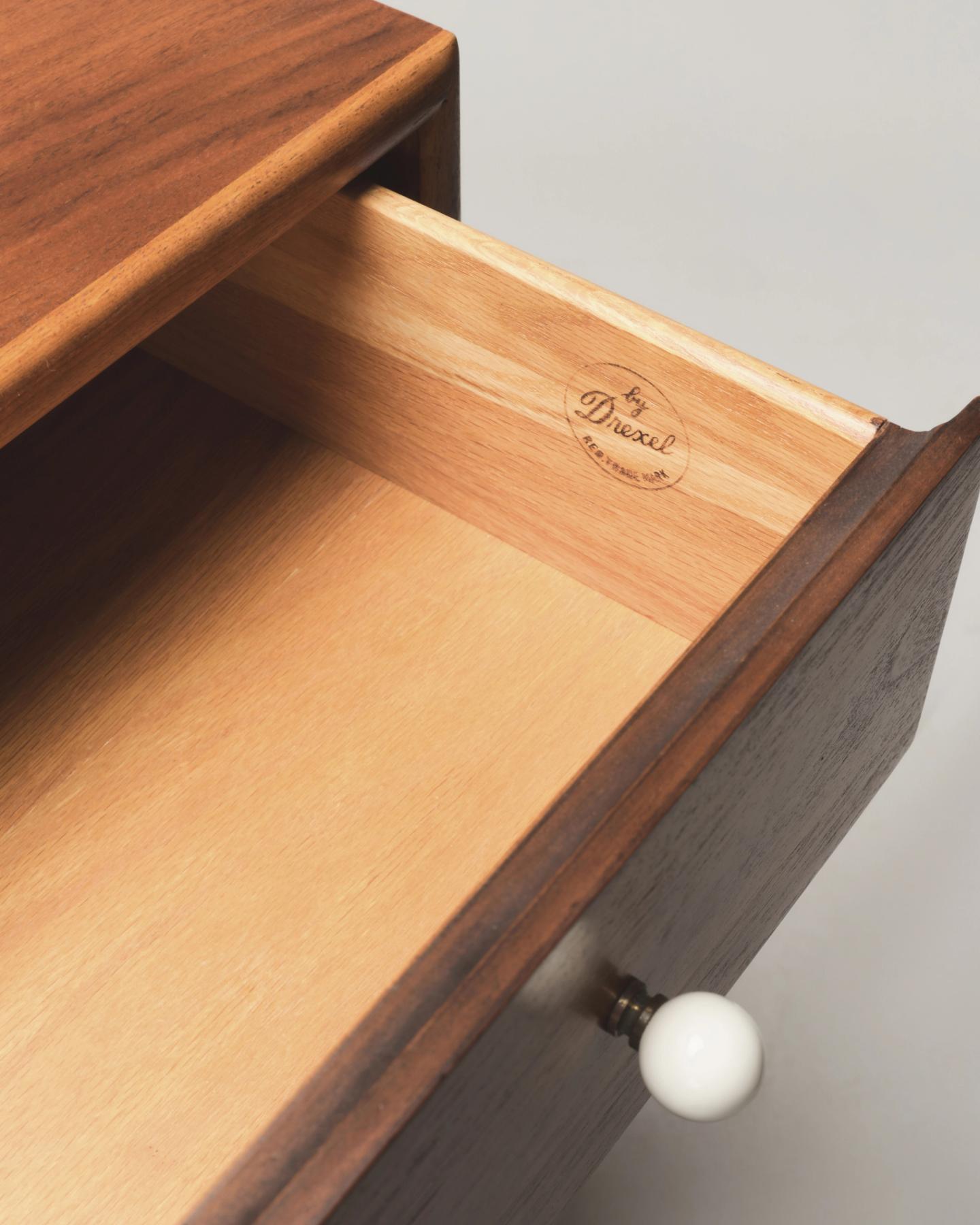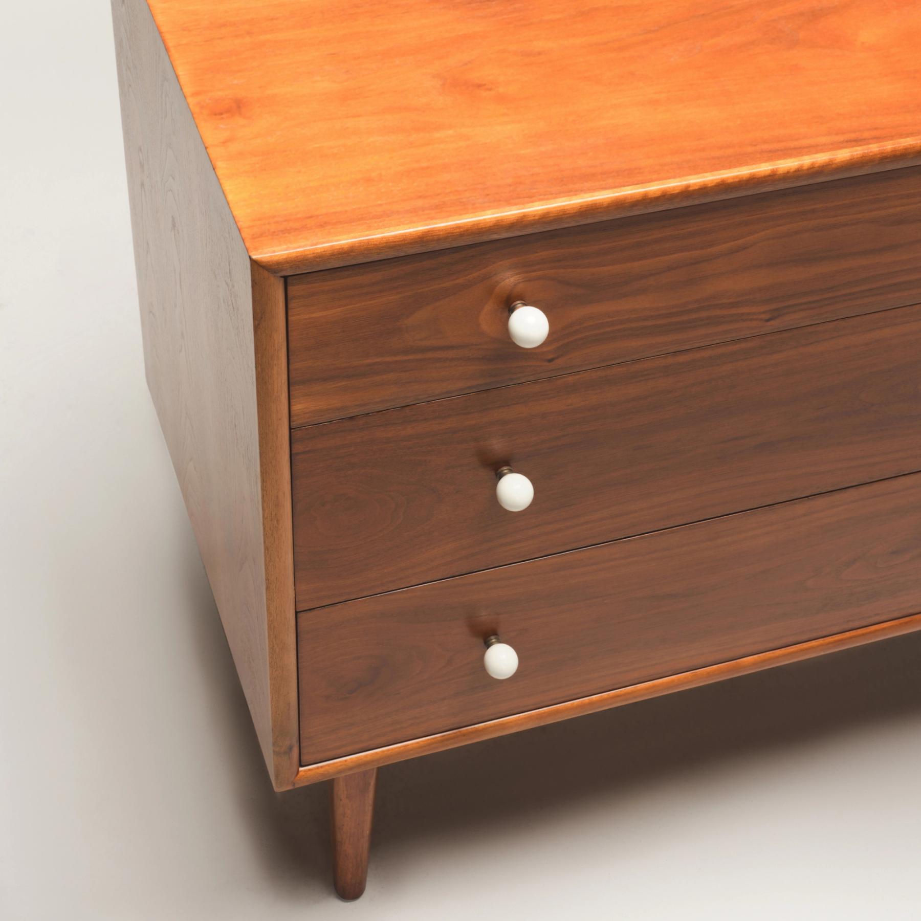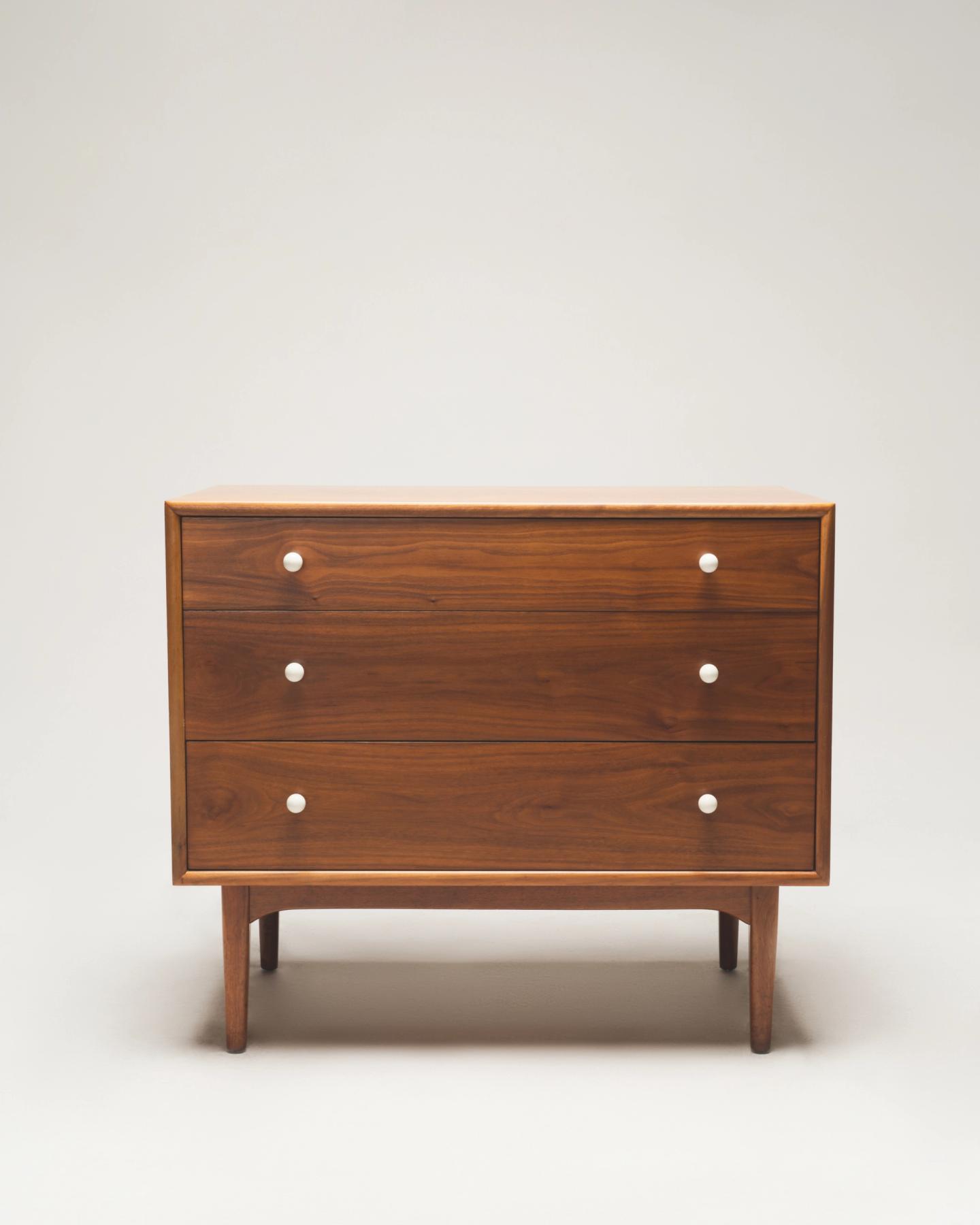 This midcentury dresser was designed by Kipp Stewart Jr. for Drexel in the 1960s. This walnut 3-drawer dresser set maintains their original porcelain knobs.