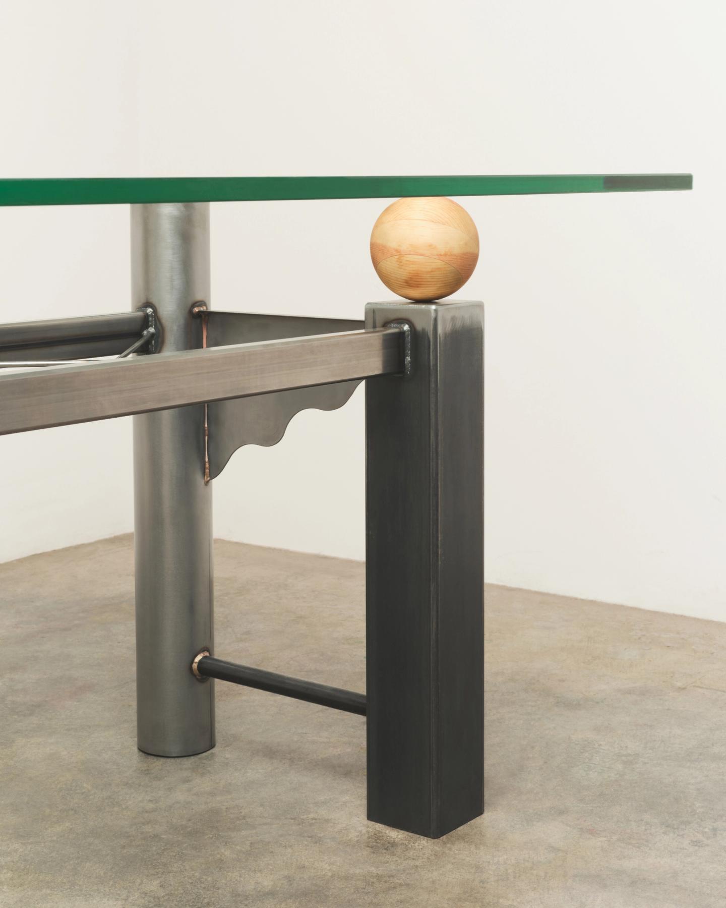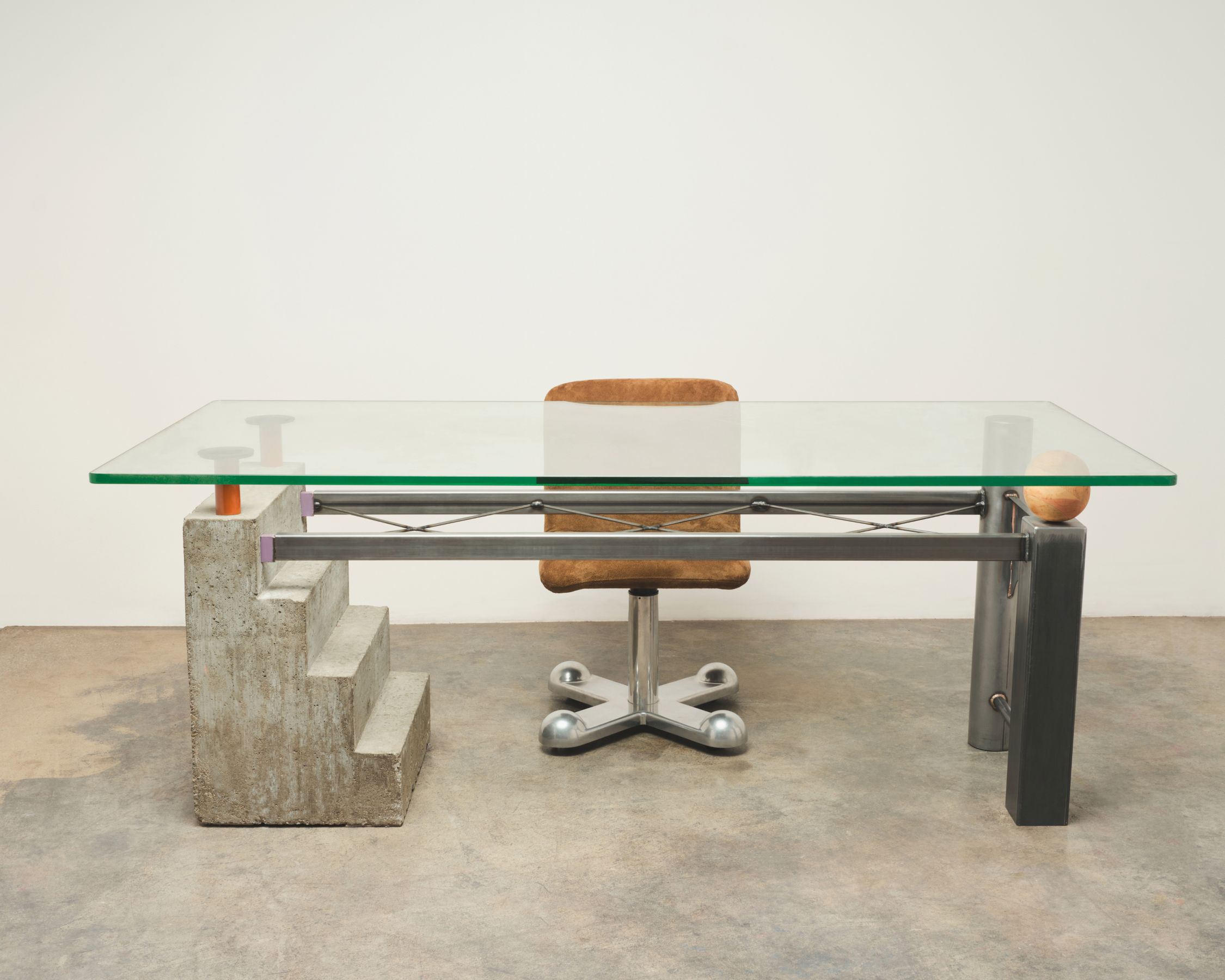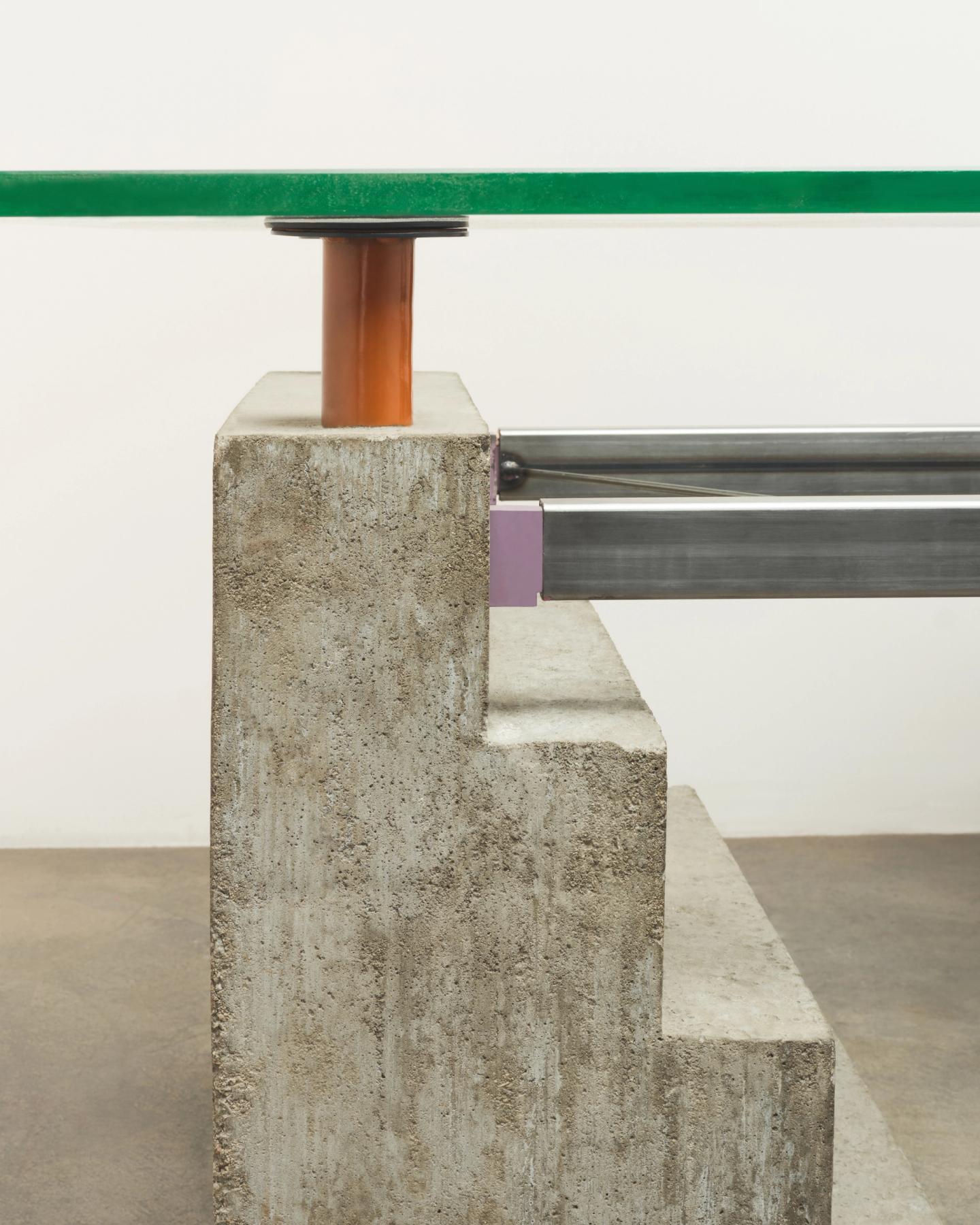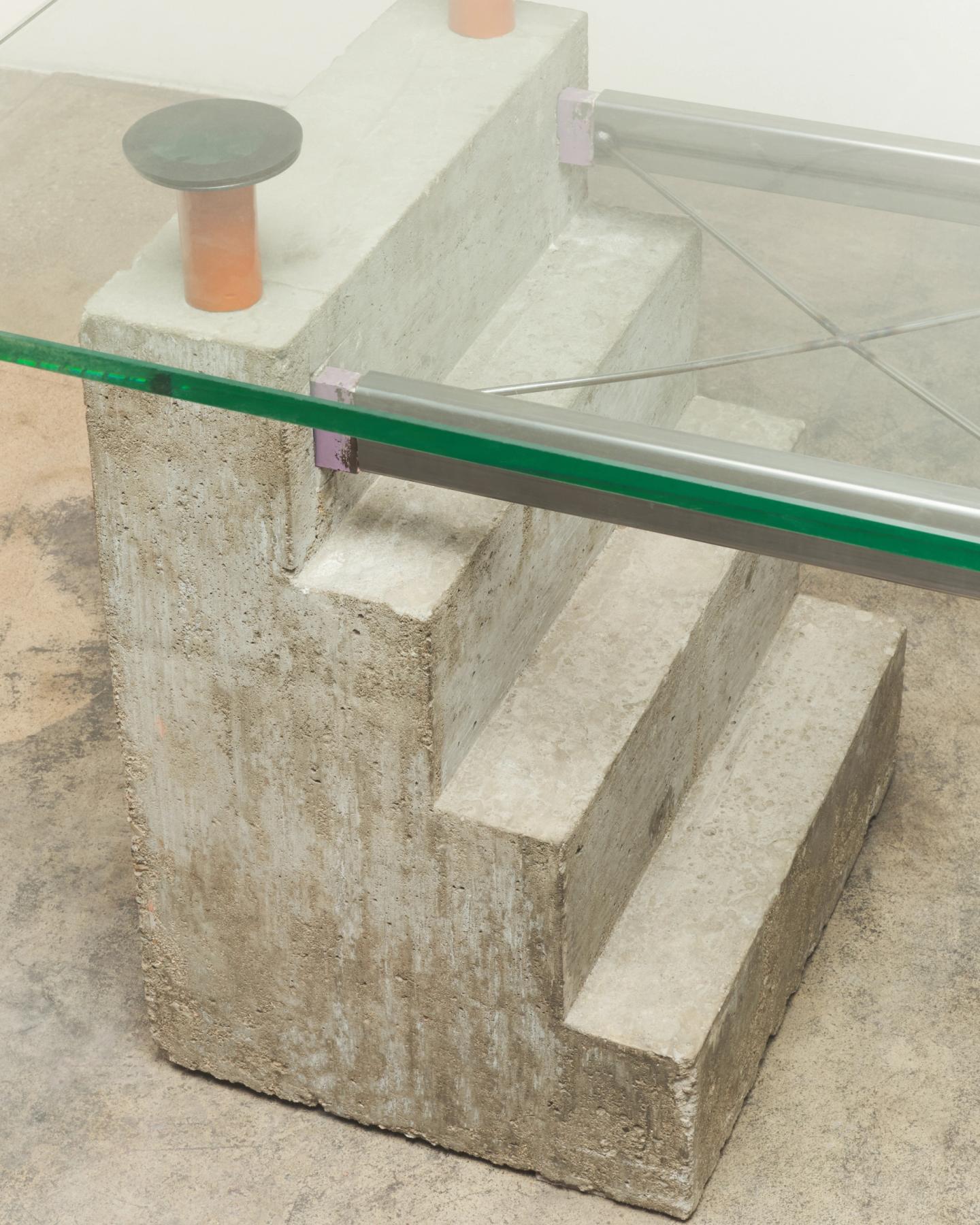 This table is comprised of 2 pieces, a glass table top and a colorful postmodern concrete base.