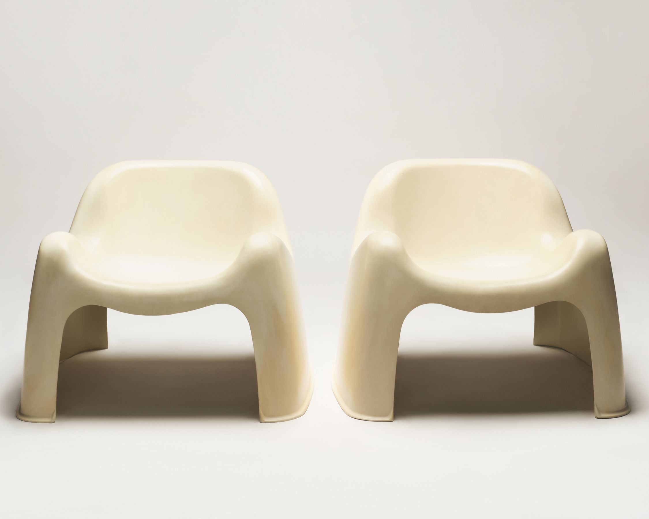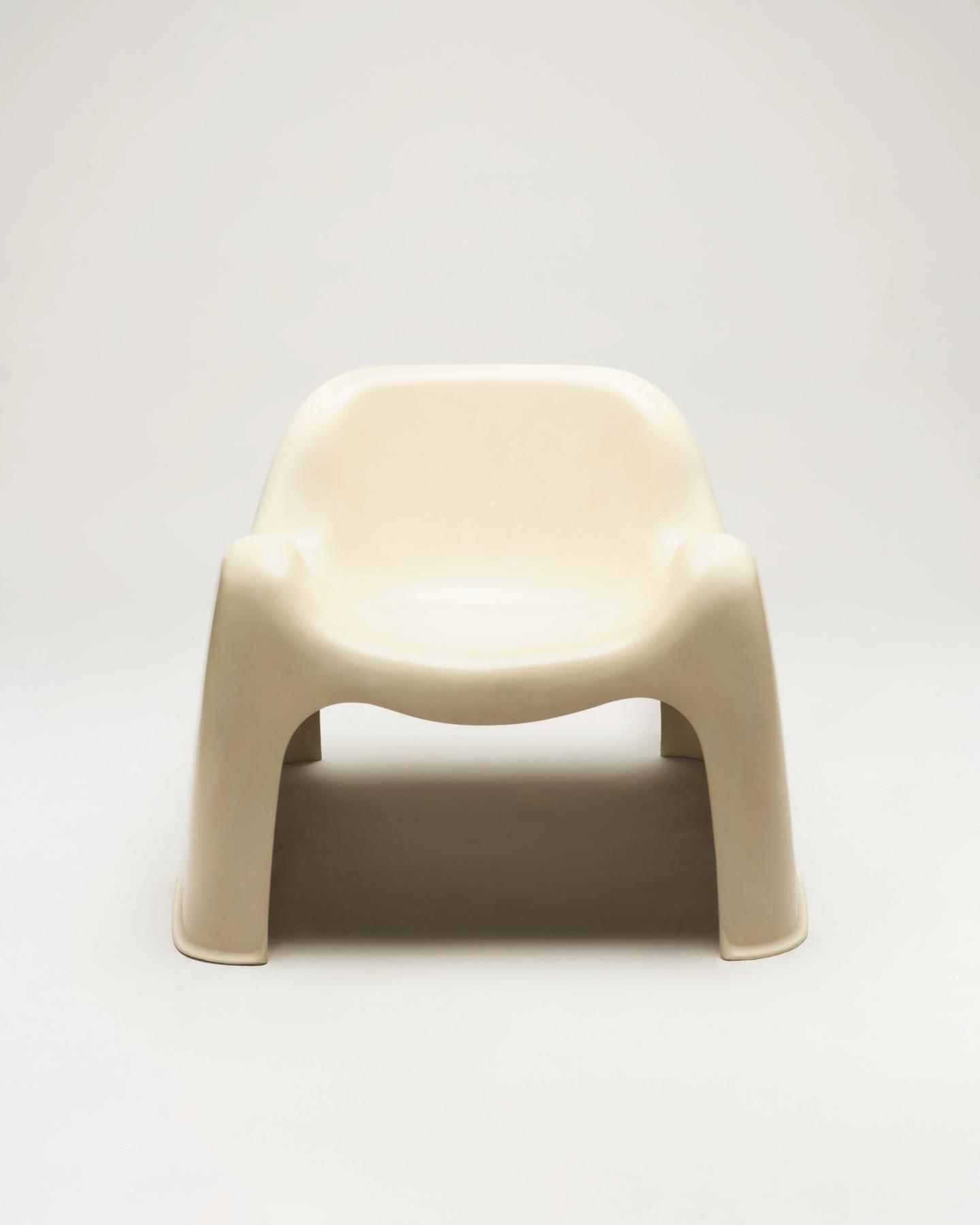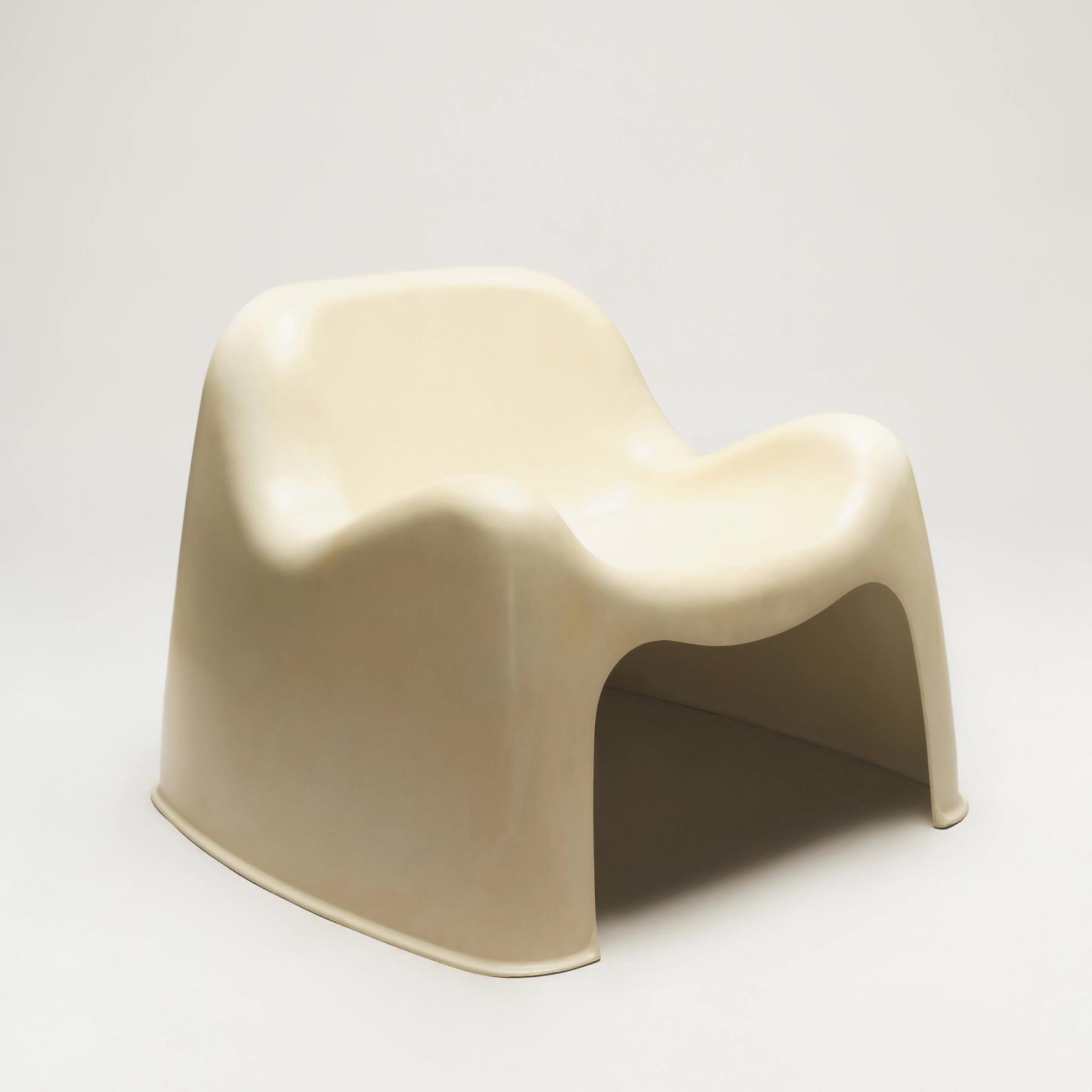 Designed by Sergio Maza and produced by Artemide in 1968, the "Toga" chair is made of cream fiberglass and cast in one piece.